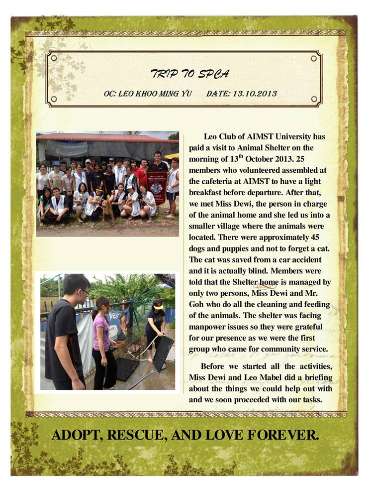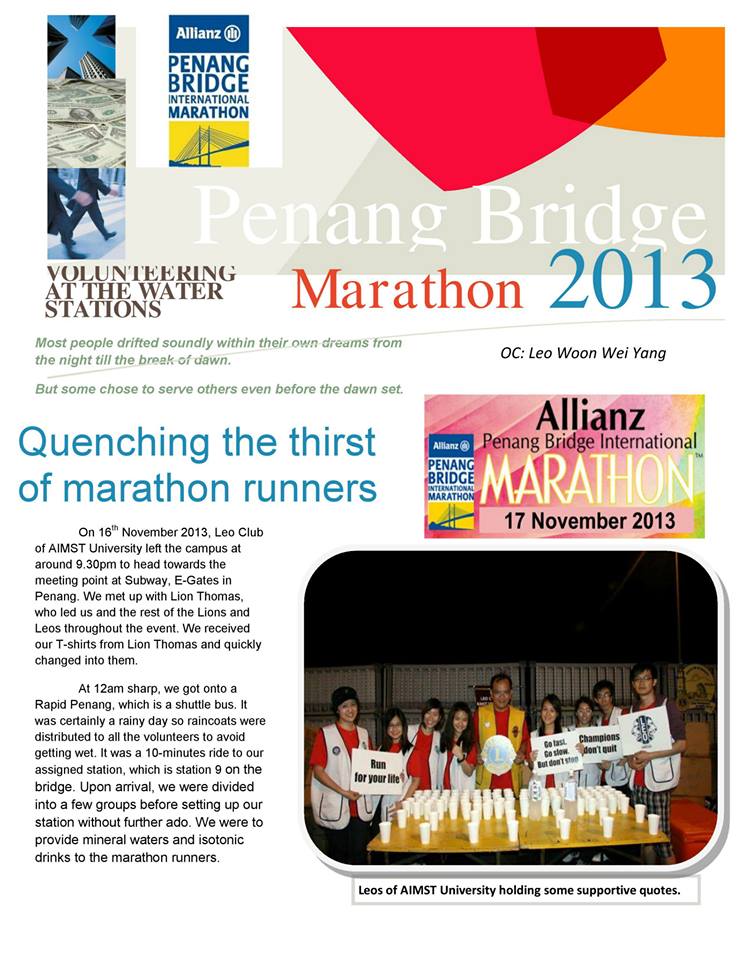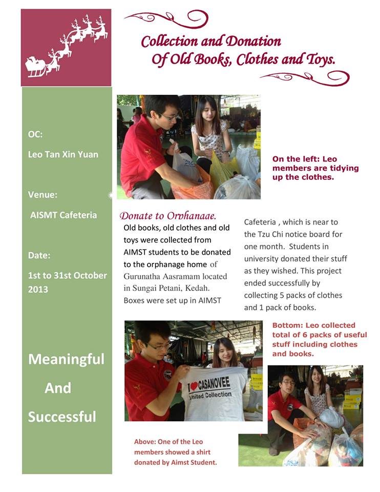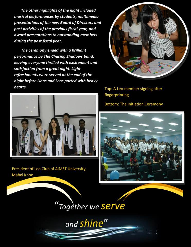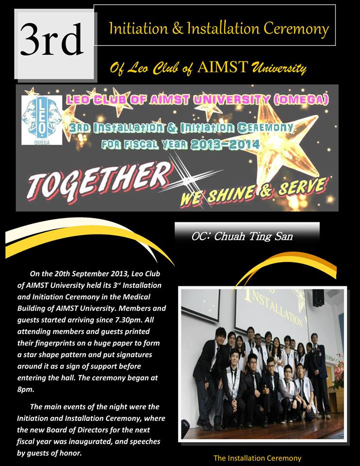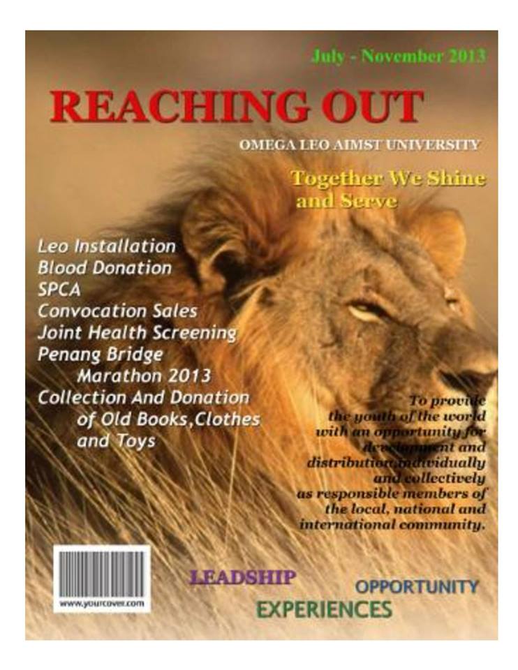 This is the first issue of newsletter by the LEO CLUB OF AIMST UNIVERSITY (OMEGA) from District 308 B2. It contains description of projects and activities that organized by us from July until November 2013. Please have a look to know more about us ^^ ROAR!!