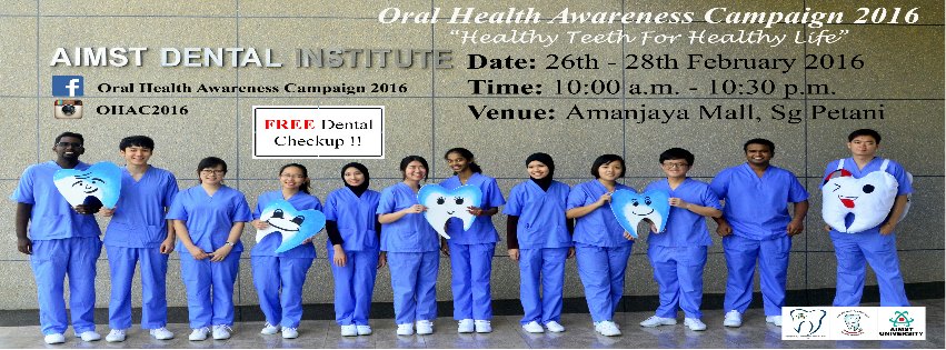 Oral health is omnipresent in our lives, in every simple daily activity: when we smile, talk, eat or sing. This is the reason that Aimst Oral Health Awareness Campaign exists, to remind us of the importance of oral health and how it directly affects so many things we do and enjoy in our daily lives. On the 26th to 28th of February 2016, we are delighted to present to you our annual Oral Health Awareness Campaign at the main concourse area of Amanjaya Mall and we will have the opportunity to raise awareness and encourage individuals, families, health associations, communities and institutions to take action to reduce all forms of oral diseases.