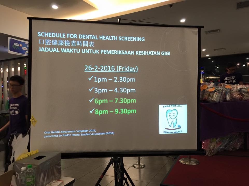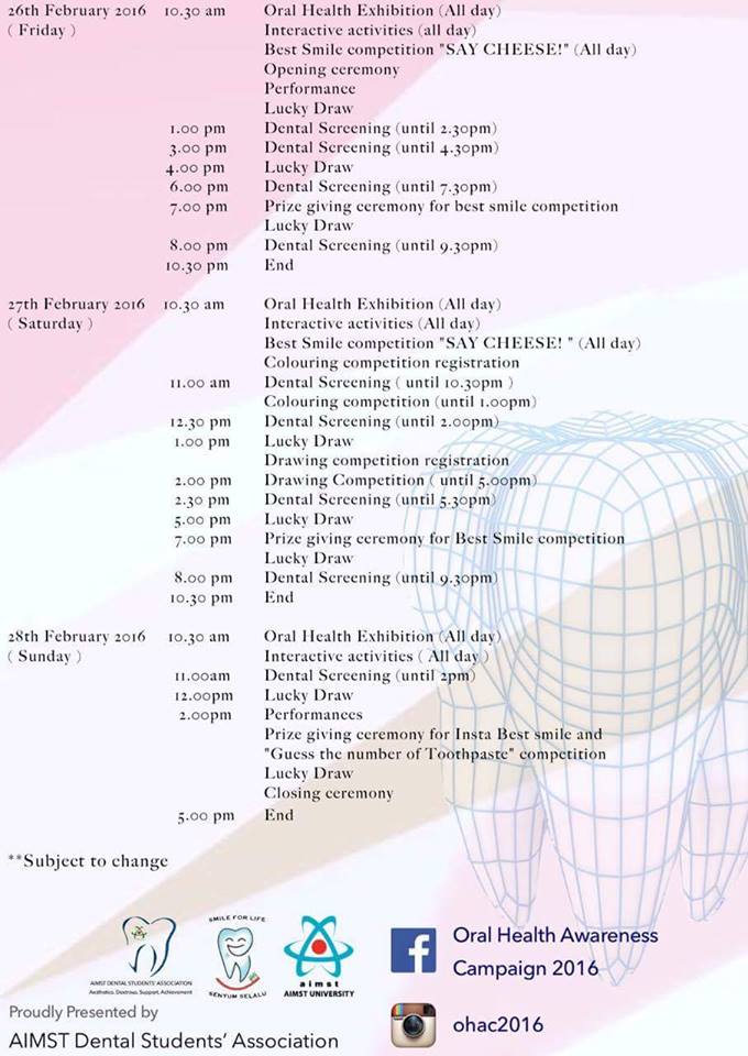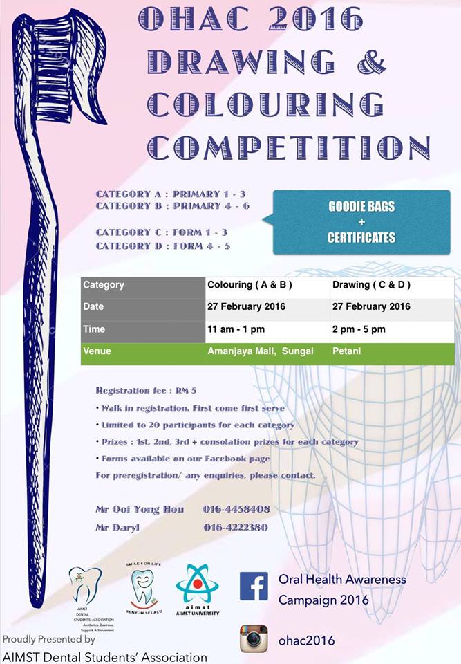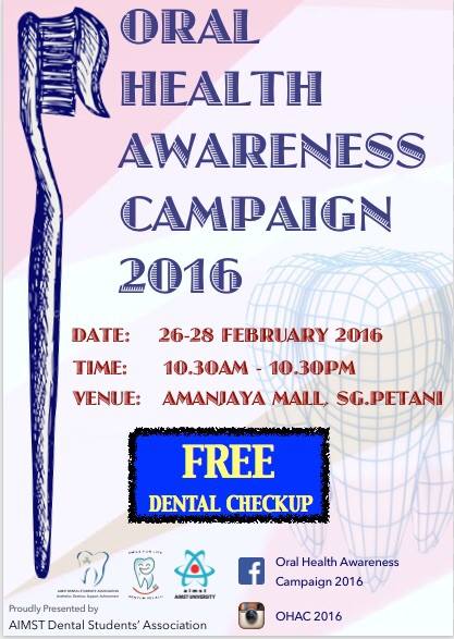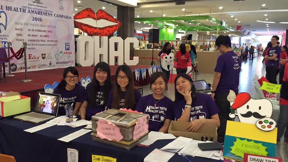 OHAC was held in Amanjaya Mall on 26th to 28th february 2016. We have this event every year and we are glad to serve the community continuously. We would like to thank all our sponsors, which we couldn,t ennumerate one by one over here, but whom we are deeply indebted to; the Faculty of Dentistry in AIMST University, especially the lecturers who guided us throughout the planning of the event; and also the community in Sungai Petani who had showered us with tremendous support.